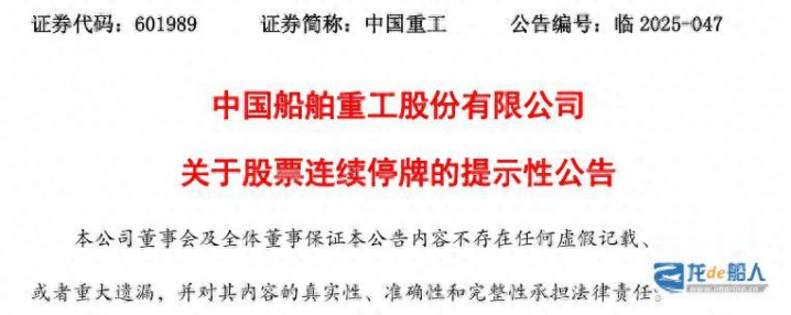 8月4日晚间, 中国船舶、中国重工双双发布发布《关于股票连续停牌的提示性公告》。